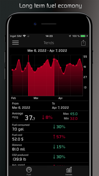 Hondata Completeのユニークな機能の1つは、燃費の追跡とガソリン代の節約ができることです。このアプリでは、0-5分、0-30分、0-2時間の間のライブおよび平均燃費の追跡、および6つの異なる間隔での長期的な追跡が提供されます。4つの異なる単位から選択し、切り取りやスクロールが可能な長期データのインタラクティブなグラフを表示することができます。また、走行距離、平均速度、費やした金額、CO2排出量、燃料消費量などの他の統計情報も利用できます。
